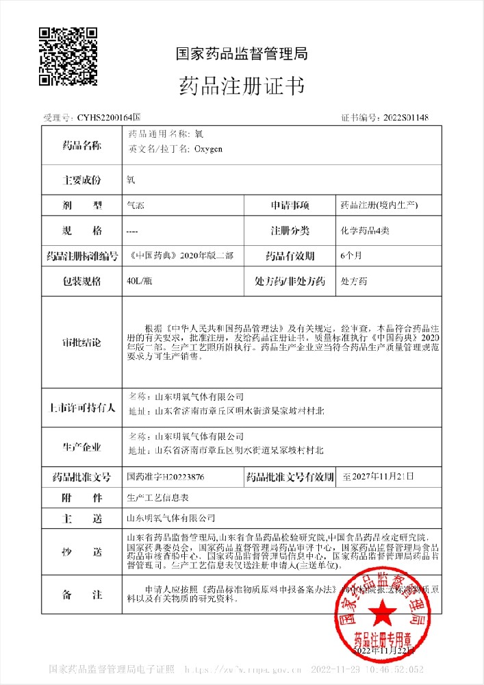 2022年12月取得國(guó)家藥品監(jiān)督管理局頒的藥品注冊(cè)證書(shū),醫(yī)用氧項(xiàng)目正式投入生產(chǎn)